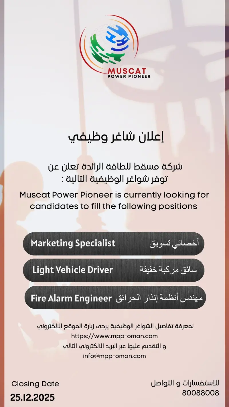 أعلنت شركة مسقط للطاقة، إحدى الشركات الرائدة في مجال الطاقة بسلطنة عمان، عن فتح باب التوظيف للعديد من التخصصات الحيوية لعام 2026. هذه الفرص متاحة للباحثين عن العمل الراغبين في الانضمام إلى بيئة عمل احترافية ومتميزة.