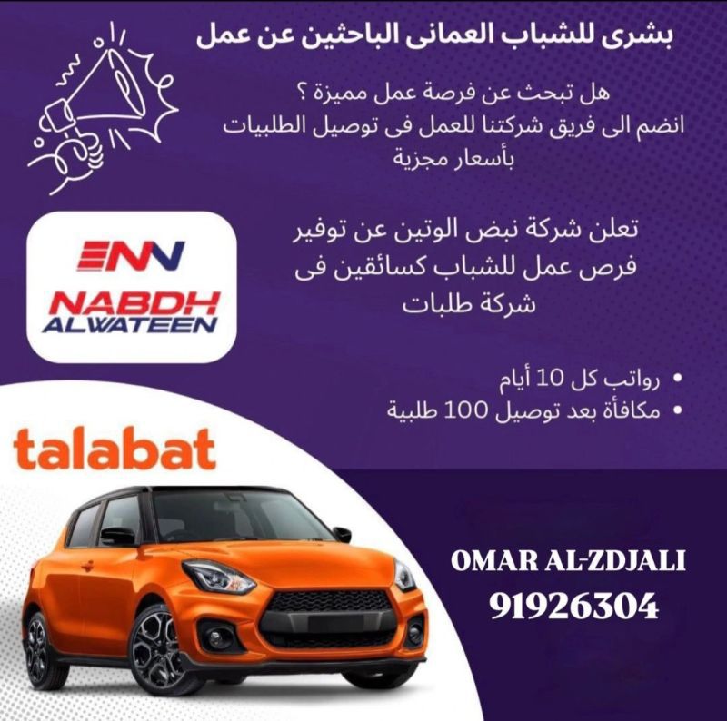 تعلن شركة نبض الوطين عن فتح باب التوظيف للشباب العماني كسائقين لتوصيل الطلبات. تتمتع هذه الوظائف بالعديد من المزايا: