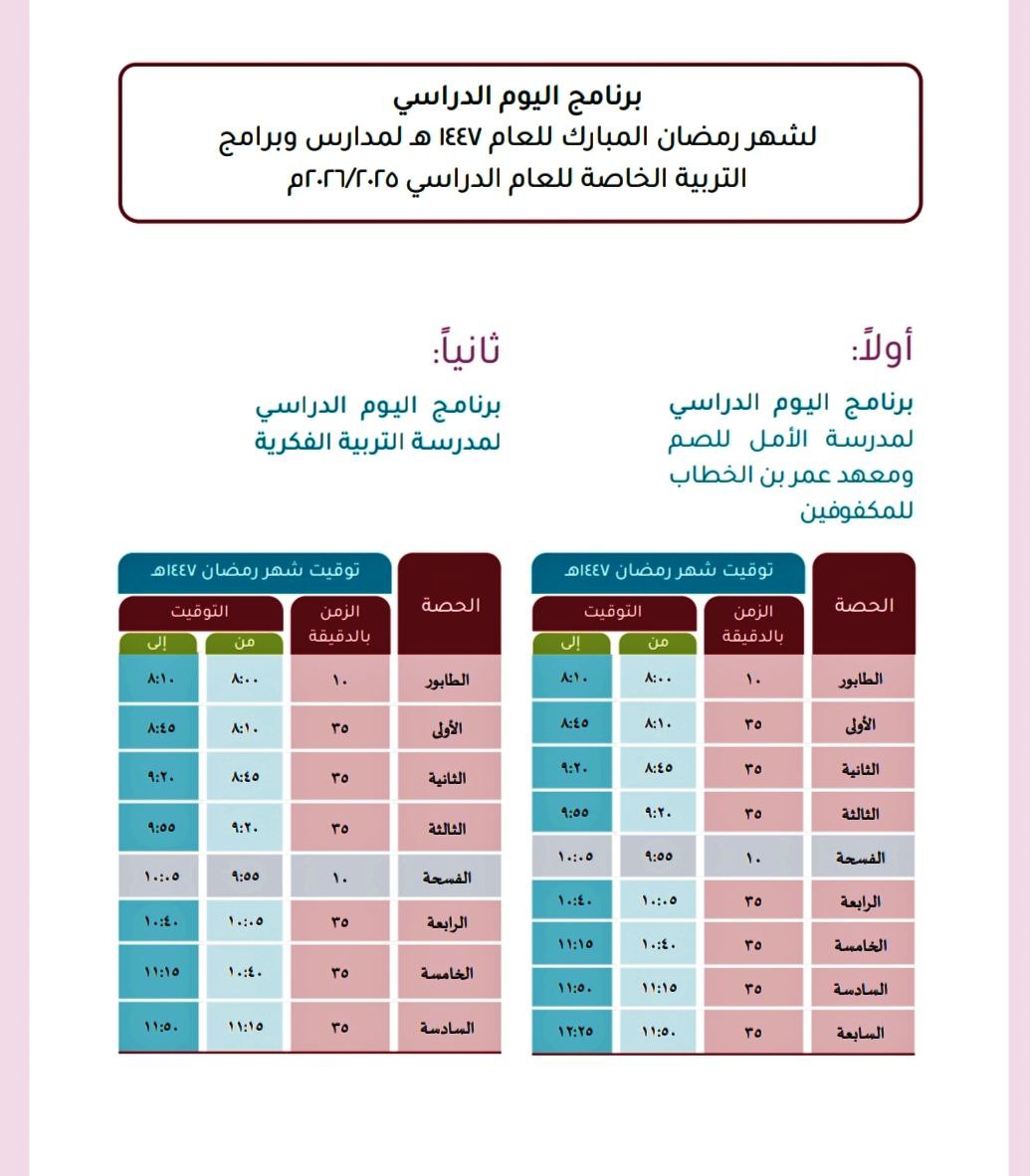 - مدة الحصة: تقرر أن تكون مدة الحصة الدراسية 35 دقيقة فقط، مراعاة لظروف الصيام.