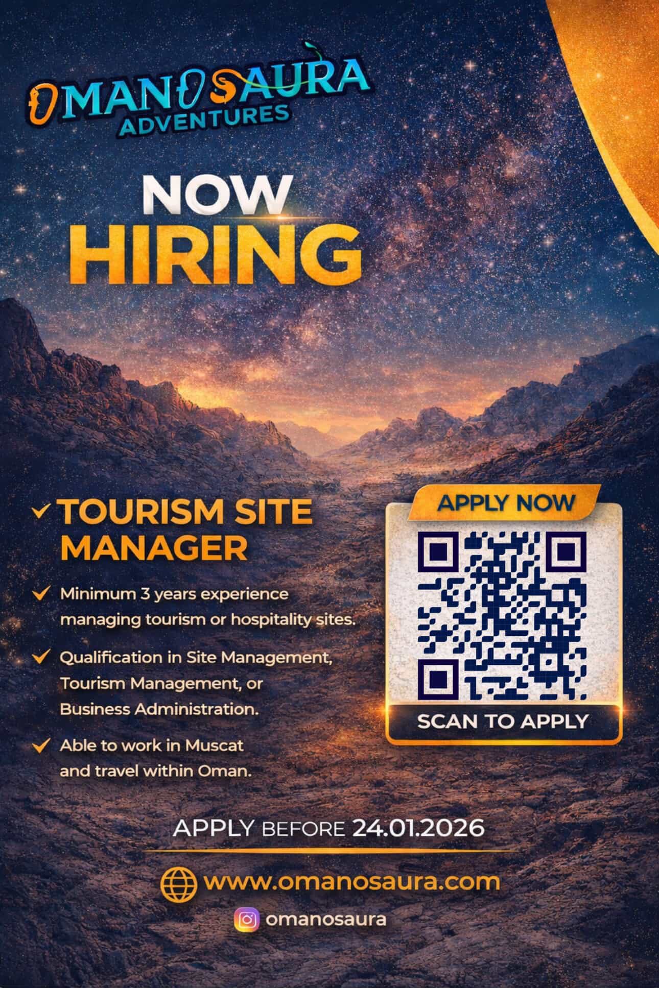 أعلنت شركة عمانوصورا للمغامرات (Omanosaura Adventures)، الرائدة في إدارة الوجهات السياحية، عن فتح باب التوظيف لشغل منصب قيادي مهم هو “مدير موقع سياحي” (Tourism Site Manager)، وذلك في إطار التوسع المستمر لقطاع السياحة والضيافة في سلطنة عمان.
